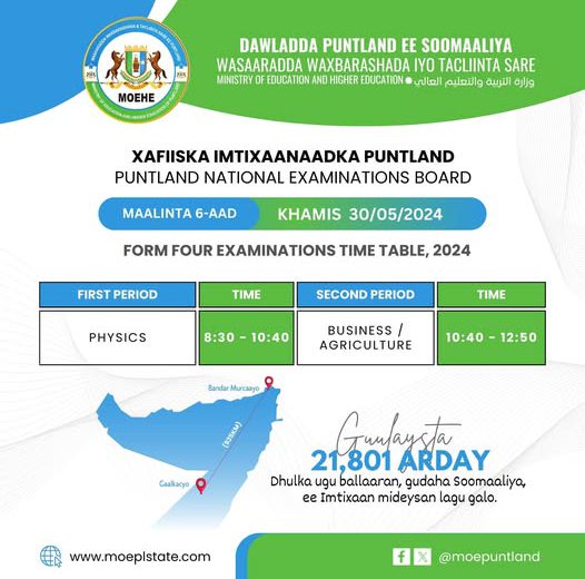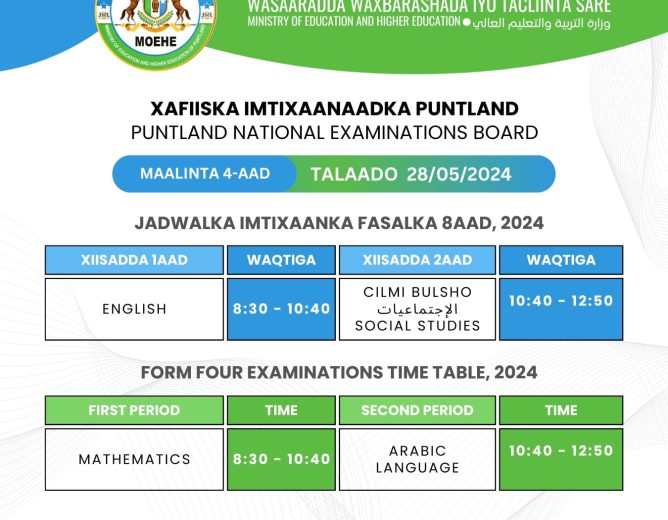 Jadwalka maalinlaha ah: Ardayda Puntland ee fasallada 8-aad iyo 12-aad, maanta waxay u wada fariisanayaan Maadadii...