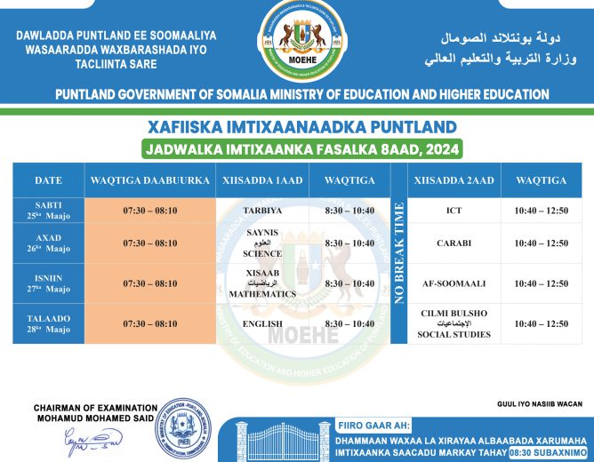Jadwalka Imtixaanka Shahaadiga ee Fasalka 8aad, sannad-dugsiyeedka 2023/2024. Bahda Waxbarashada Puntland waxa ay kula dardaarmayaan Ardayda...
