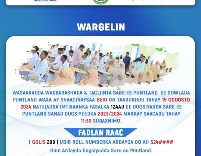 Wasaaradda Waxbarashada iyo Tacliinta ee Dowlada Puntland waxay barri insha allah shaacin doontaa Natiijadii Imtixaanka ee...