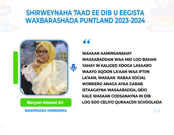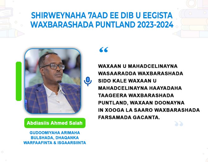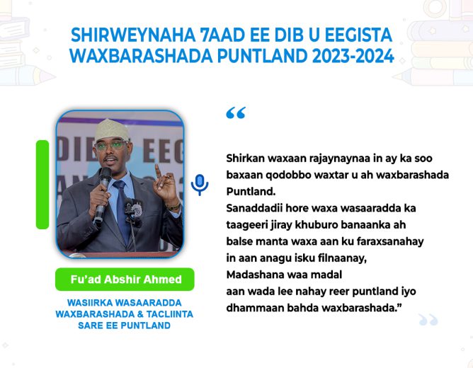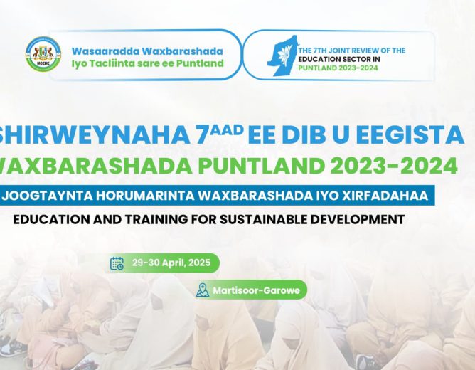 Xubanaha Goleyasha Dowladda Puntland, bahda waxbarashada iyo daneeyeyaasha caalamiga ah ayaa haatan ka qeyb-galaya furitaanka Shirka 7aad ee dib u eegista waxbarashada Puntland.