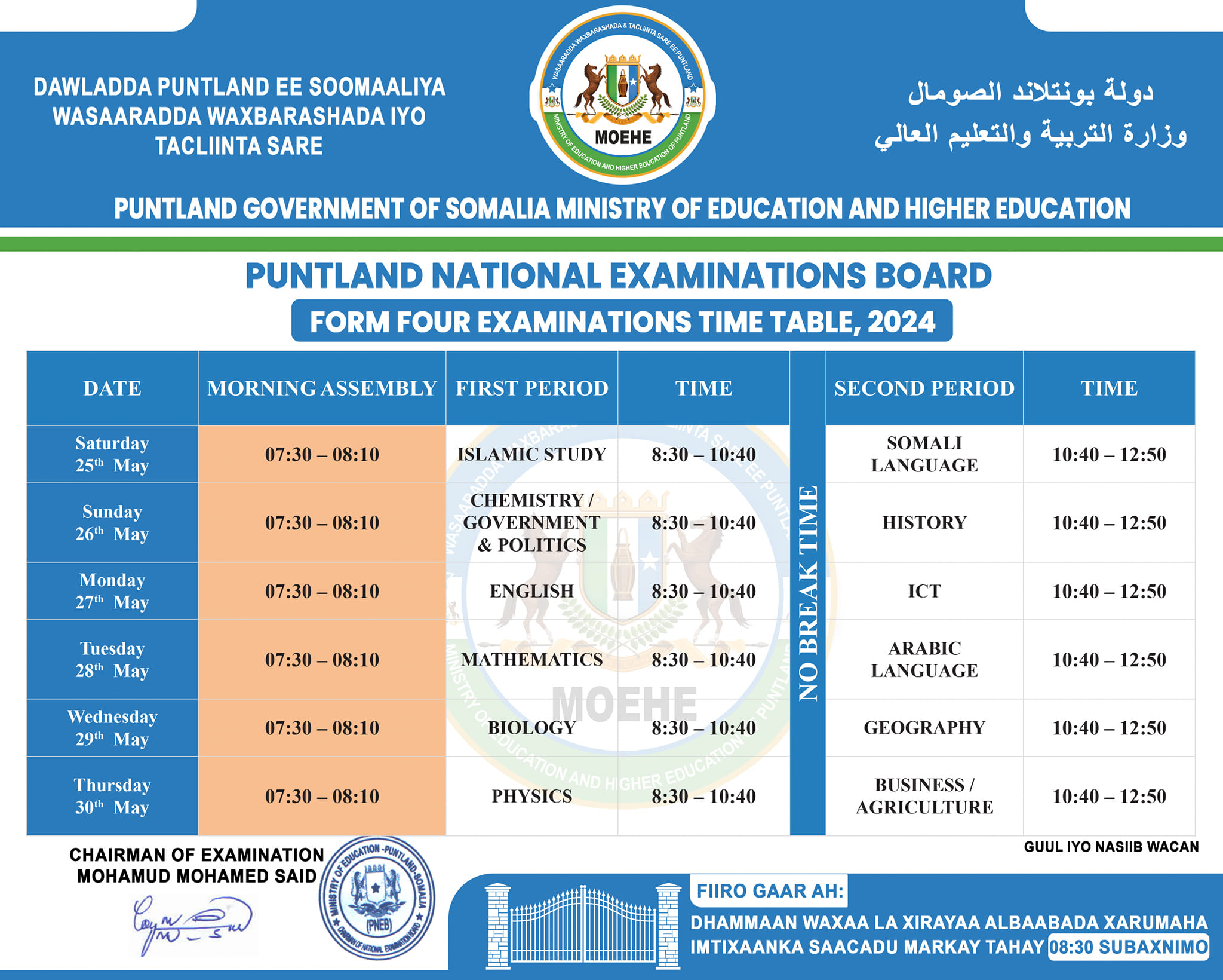 Bahda Waxbarashada Puntland waxa ay kula dardaarmayaan Ardayda imtixaanaadka u fariisanaya in ay ku dadaalaan akhrinta casharradooda, rumeeyaanna rajada waalidkood, dowladda iyo guud ahaan dadka reer Puntland ee ku hanweyn mustaqbalkooda.