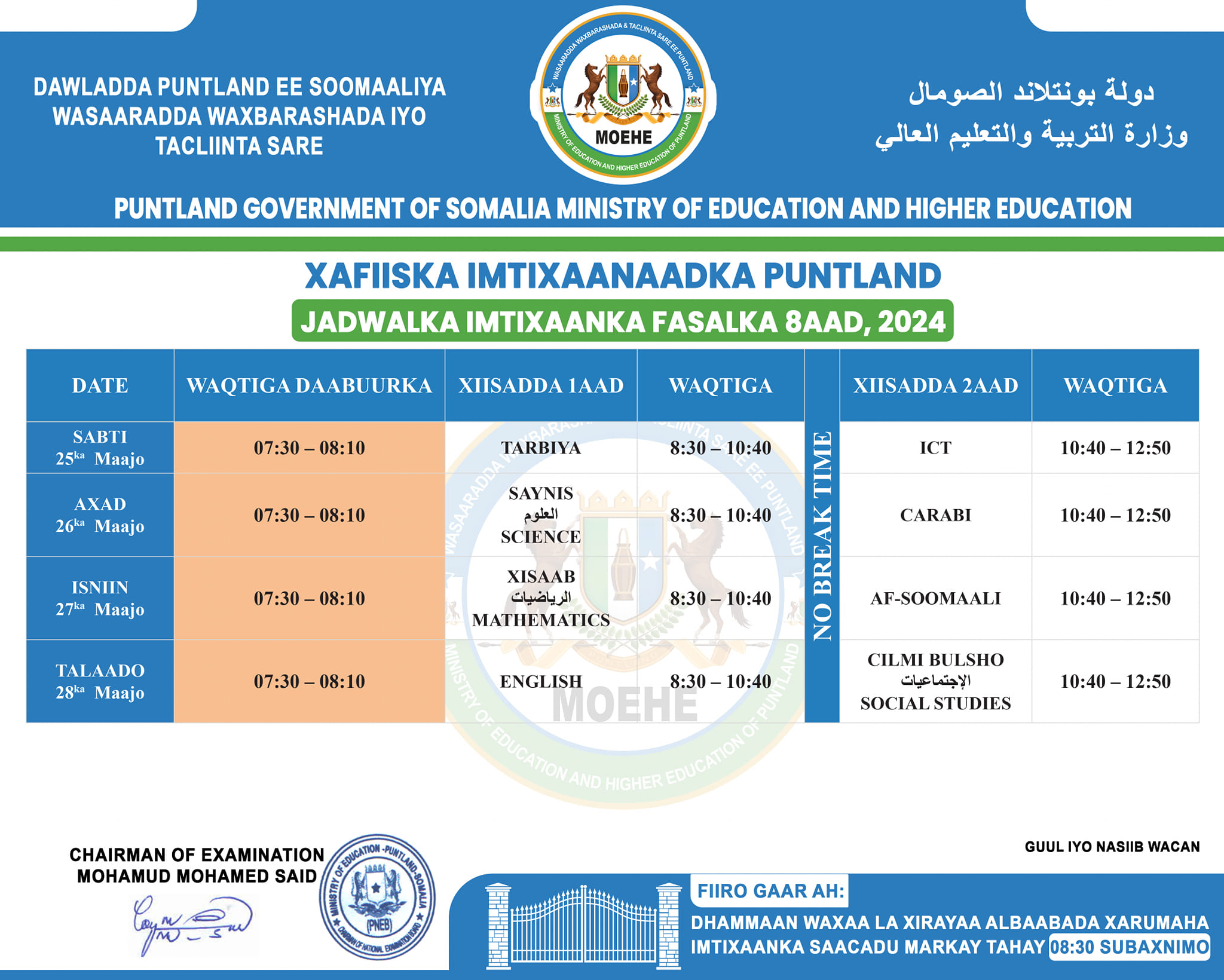 Jadwalka Imtixaanka Shahaadiga ee Fasalka 8aad, sannad-dugsiyeedka 2023/2024.