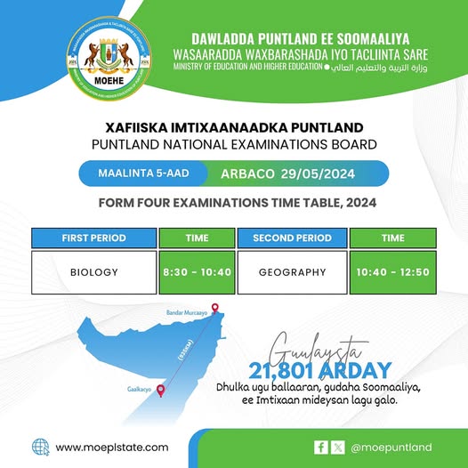Wasaaradda Waxbarashada iyo Taciinta Sare ee Dowladda Puntland waxay guul u rajaynaysaa dhammaan ardayda.
