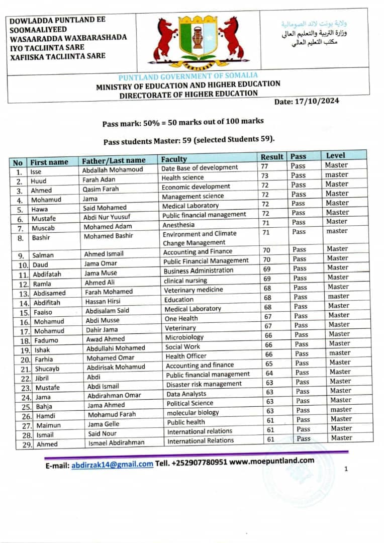 October 17, 2024 Competition Editor Natiijada Imtixaanka Deeqaha Masterka iyo PhD-da ee sanadka 2024/2025. Natiijada Imtixaanka Deeqaha Masterka iyo PhD-da ee sanadka 2024/2025. Share: