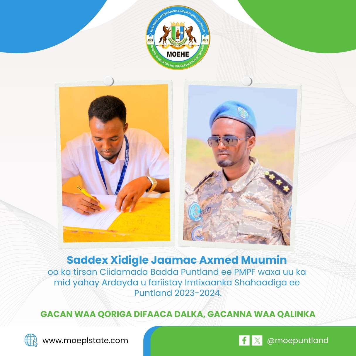 Ardayda sannadka u fariistay imtixaanka shahaadiga ah ee Puntland waxaa ka mid ah Taliye Jaamac Axmed Muumin oo ah Sarkaal ka tirsan Ciidamada Ilaalada Badda Puntlan ee PMPF.