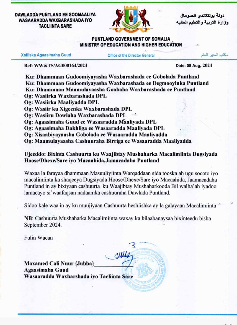 Wasaaradda Waxbarashada iyo Tacliinta Sare ee Dawladda Puntland Waxay cadaynaysaa in Jaamacadda hoos ku xusan aysan wax aqoonsi ah Ama Ruqsad ah ka haysan Wasaaradda Waxbarashada iyo Tacliinta Sare ee Dowlada Puntland Sidaasna lagu hakiyay.