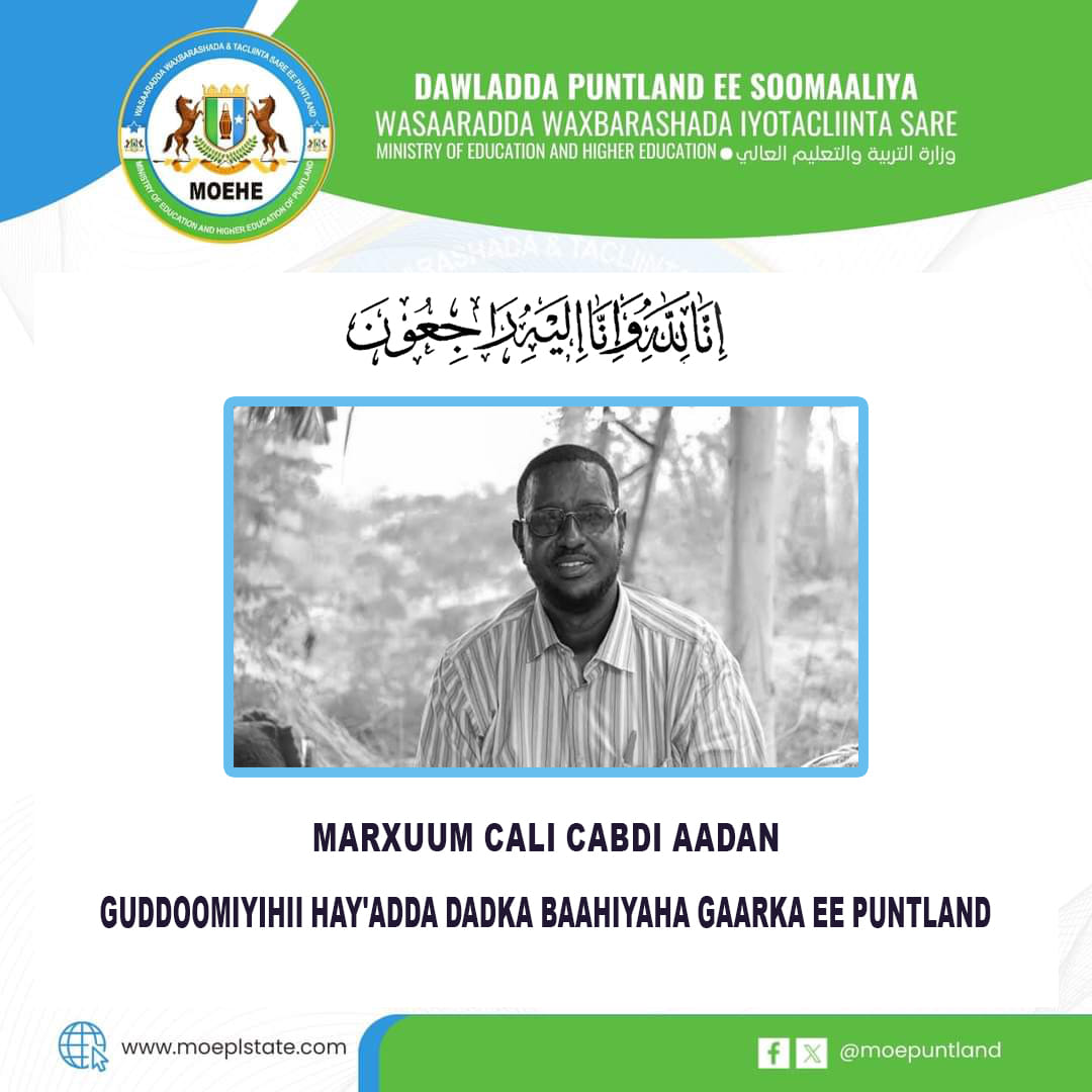 Wasaaradda Waxbarashada Iyo Tacliinta Sare ee Puntland waxay uga tacsiyeynaysaa qoyska iyo bulshada Puntland ee uu ka baxay, Alle ha u naxariistee, Guddoomiyihii Hay’adda Dadka Baahiyaha Gaarka ah ee Puntland, Marxuum Cali Cabdi Aadan.