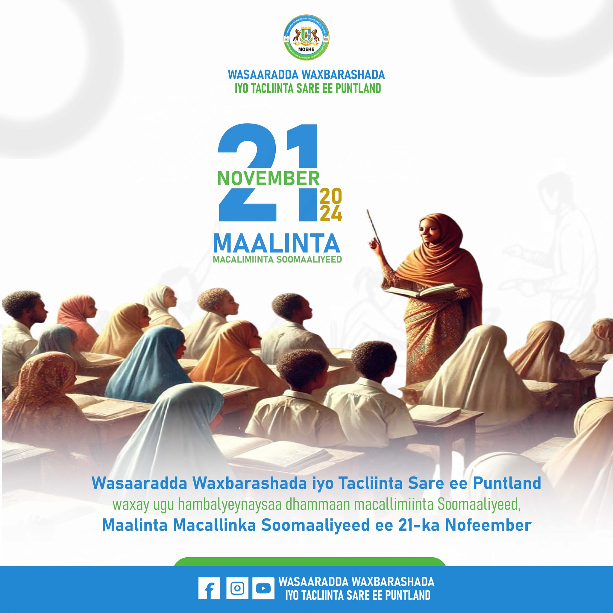 Wasaaradda Waxbarashada iyo Tacliinta Sare ee Puntland waxay ugu hambalyeynaysaa dhammaan macallimiinta Soomaaliyeed, Maalinta Macallinka ee 21-ka Nofeember.