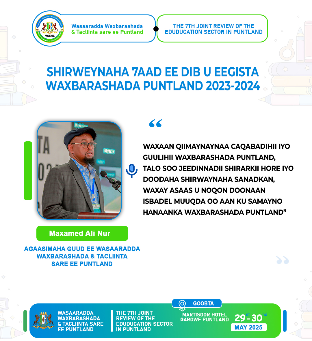 “Waxaan qiimaynaynaa caqabadihii iyo guulihii waxbarashada puntland,Talo soo jeedinnadii shirarkii hore iyo doodaha shirwaynaha sanadkan, waxay asaas u noqon doonaan isbadel muuqda oo aan ku samayno hanaanka waxbarashada Puntland”